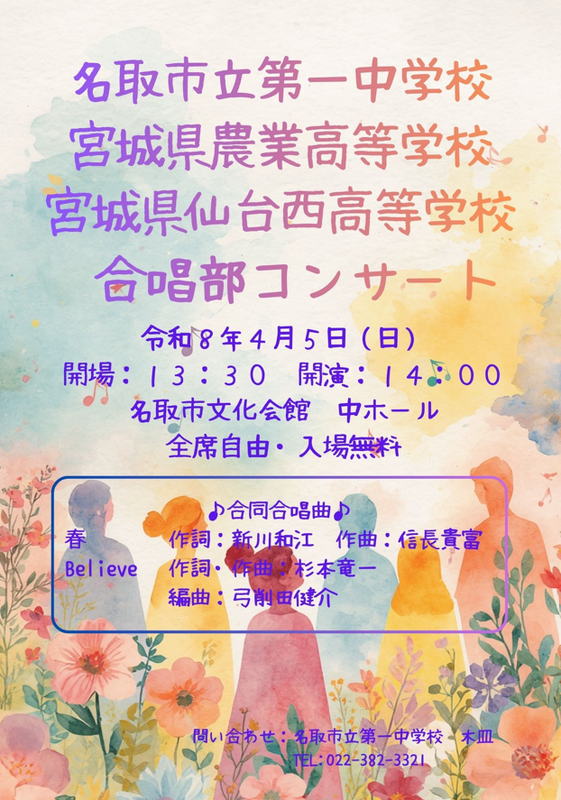 下記の通り、本校合唱部が「名取市立第一中学校・宮城県農業高等学校・宮城県仙台西高等学校合唱部合同コンサート」に出演します。各校の単独ステージおよび3校の合同ステージの構成で、女声合唱や混声合唱による多彩なプログラムが用意されています。